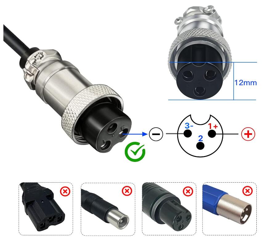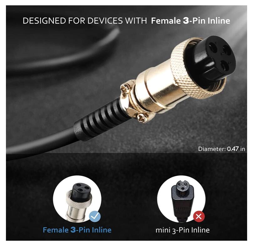3-pin interface: the hoverboard charging cable has a symmetrical 3-pin interface that is compatible with 6.5, 7, 8, 10 inch smart scooters with 2 wheels. Hoverboard charging cable with 36 V lithium battery the same type of charging head 42 V charger and other products. Please check the size of your original charger and port carefully before ordering.